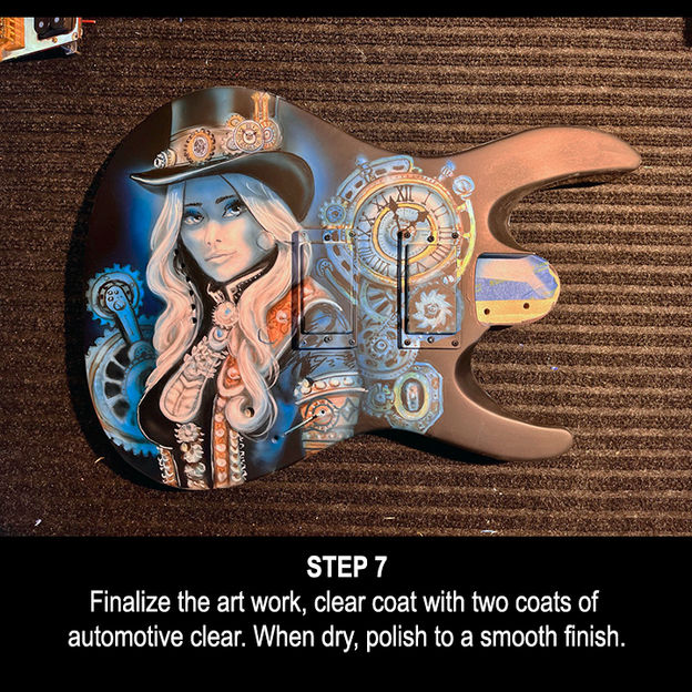 After the hand painting process is completed, all guitars receive several layers of automotive grade clear coat, then they are buffed out to achieve a very beautiful, and durable, glossy finish.